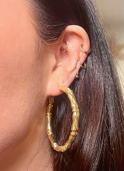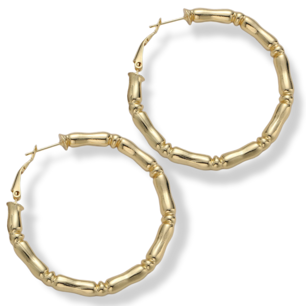 These super lightweight 14K Gold plated bamboo hoops are about 2" in diameter and have an easy on easy off lever back closure.